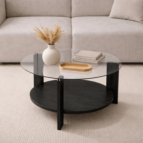 £219.00Unit price /UnavailableRound coffee table with tempered glass top - Black melamine - 90 cm - Liya