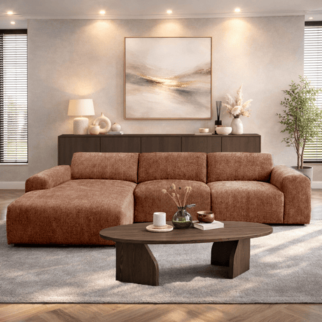 Corner sofa with chaise longue in copper chenille fabric Shane – left