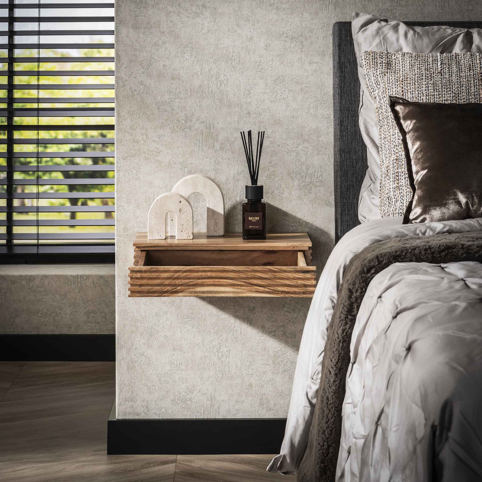 Give your bedroom a warm, natural look with this set of 2 solid acacia bedside tables. The sleek, floating design saves floor space and makes your room appear larger, while the handy drawer offers just enough space for your essentials. The beautiful grain pattern of acacia ensures a luxurious, timeless look that effortlessly blends with various interior styles.