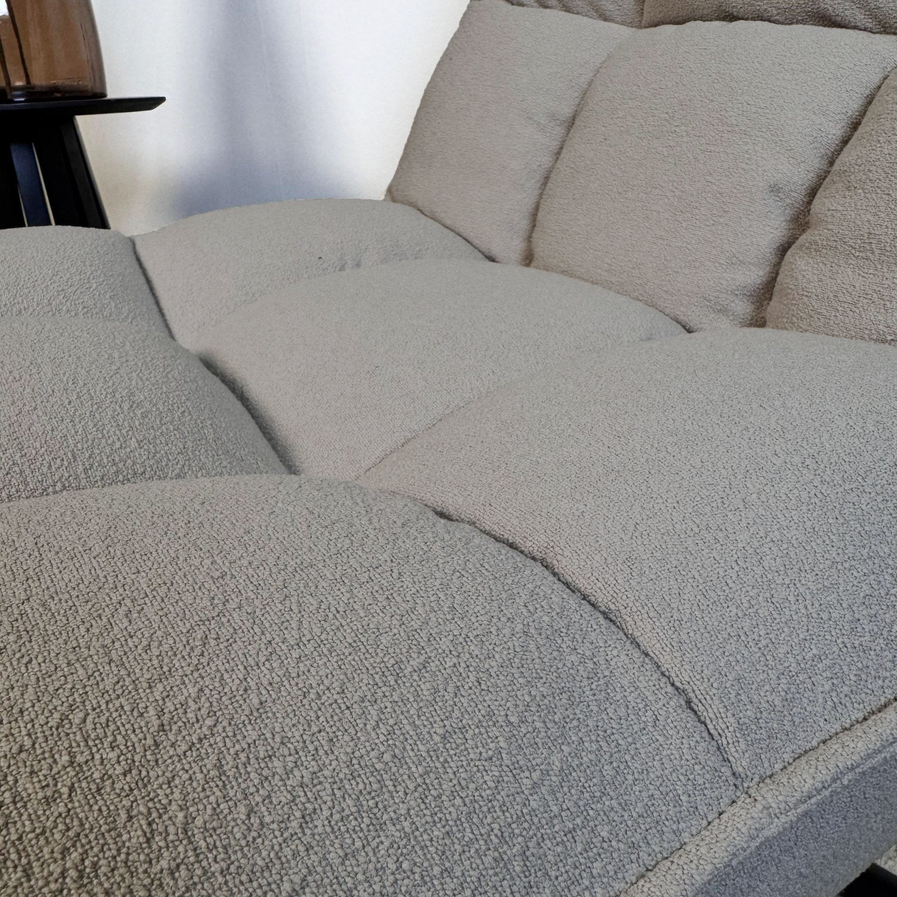 Bouclé, a durable and luxurious fabric with soft texture and loops, adds comfort and style to furniture, making it perfect for a warm and chic look in any interior.