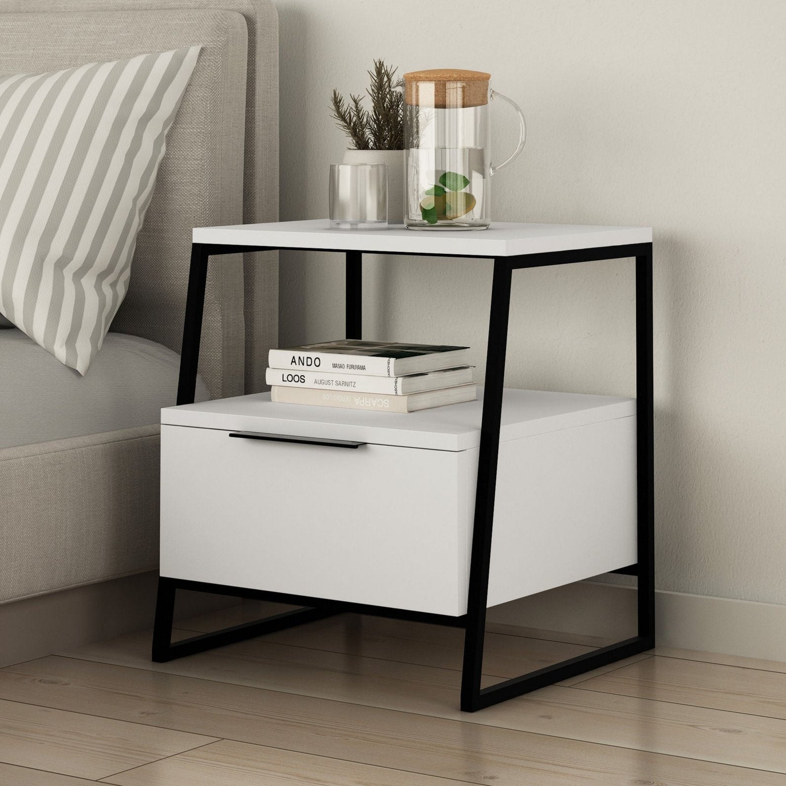 The nightstand comes in a beautiful combination of white and black, adding a touch of elegance to your bedroom decor. The contrasting colors create a visually striking piece that effortlessly fits into any color scheme or interior style.