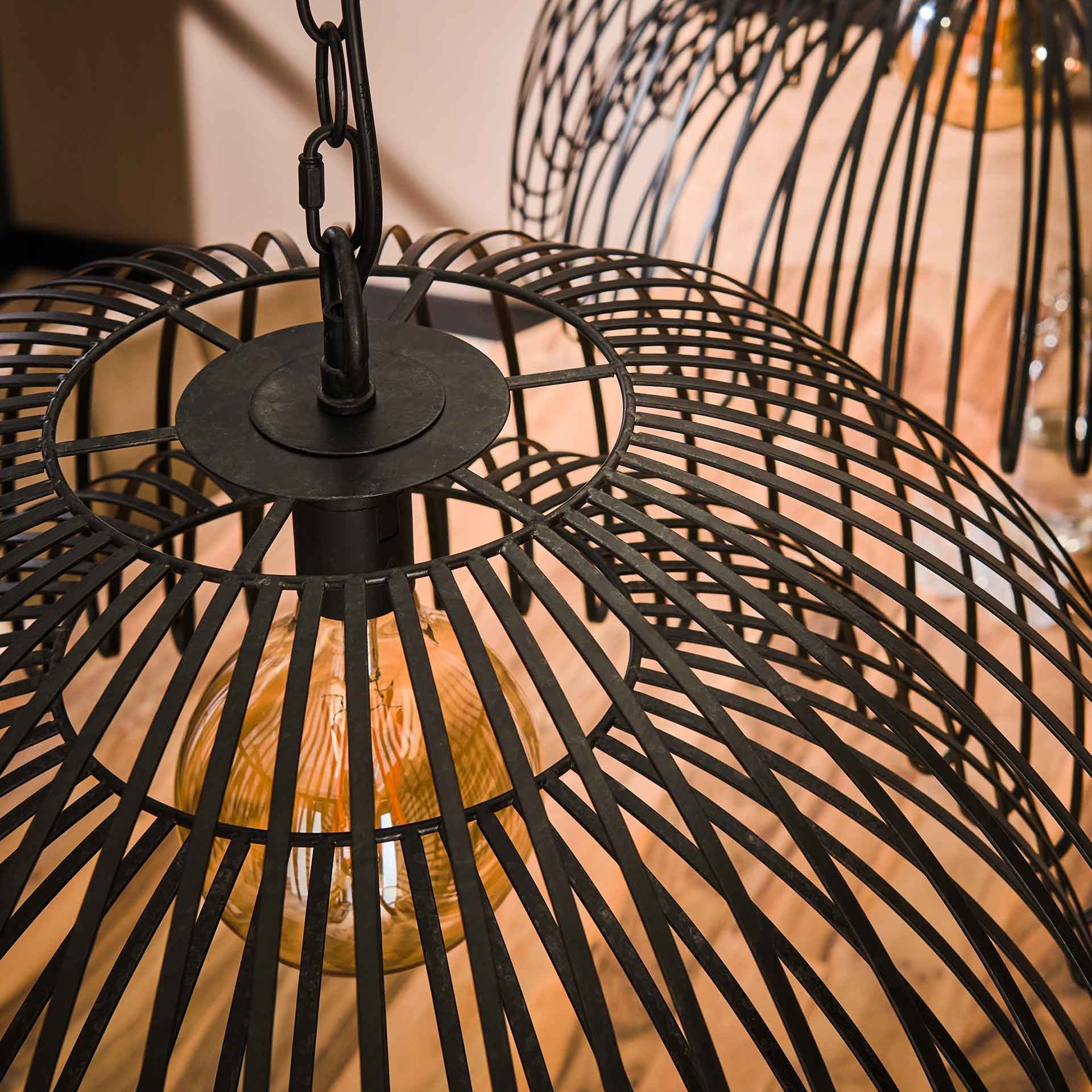 The industrial hanging lamp Bernhard is a unique lamp and consisting of two semi-open lampshades with a Charcoal finish. This hanging lamp is unique thanks to the design.  This ensures a playful light effect in your interior! Thanks to the open fixture, the light is distributed by the room. When the light comes on, a warm atmosphere is created. The Bernhard Hanging lamp fits perfectly with the industrial style and is adjustable up to 150 cm in height.