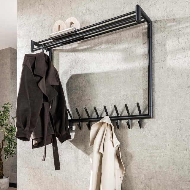 Coat rack Kym is the ideal solution for those looking for plenty of storage space and a sleek design. This spacious coat rack is made of dark gray matte powder-coated steel and is constructed from round tubes. The hat shelf, consisting of several sturdy tubes, provides extra space for storing hats, bags, and other accessories.