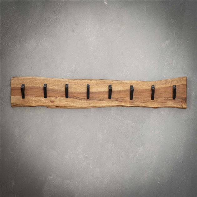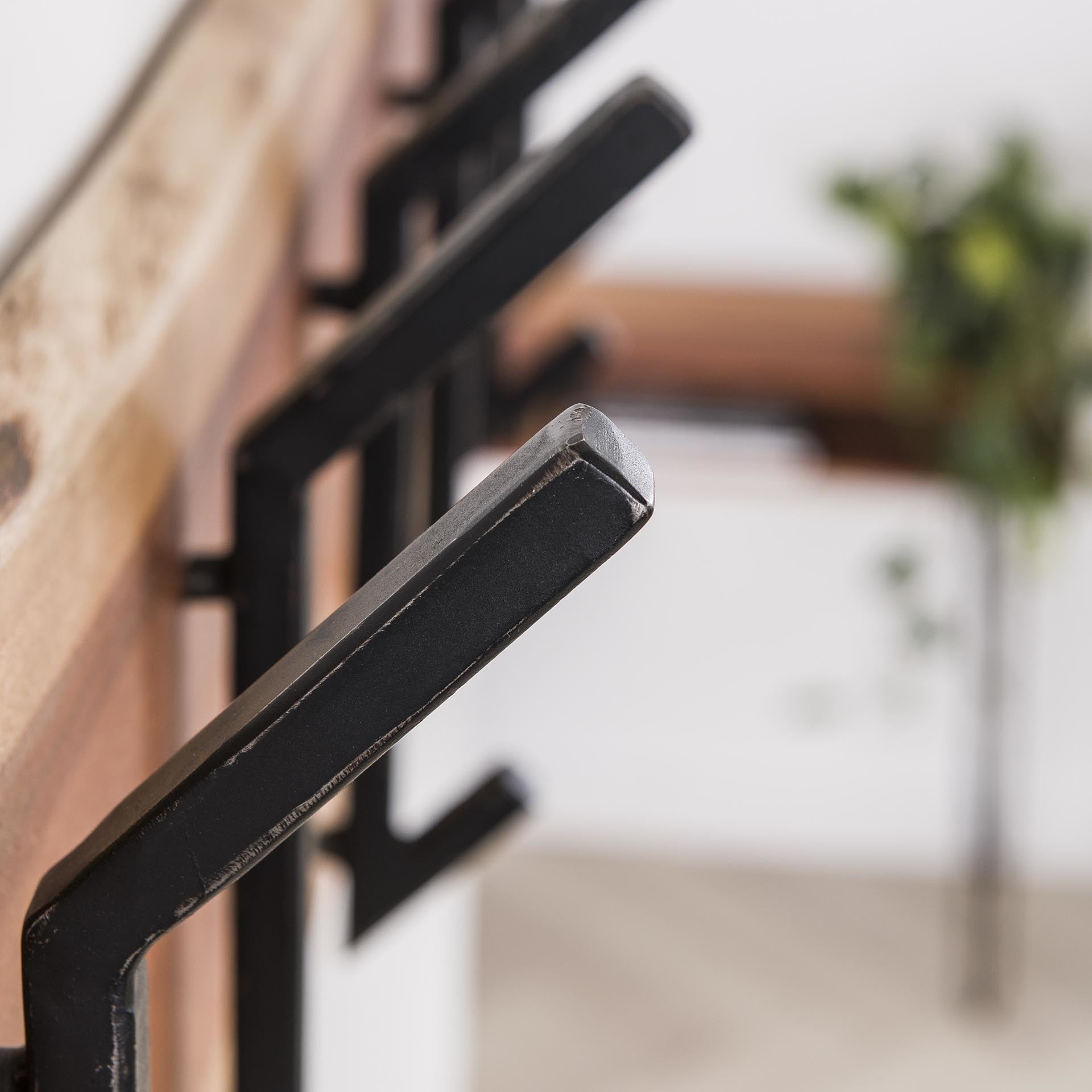 The industrial coat rack is made of solid acacia wood and looks very robust. The knots and veins in the wood give the coat rack character. The contrast between the natural plank and the metal hooks creates a stylish effect. Because the coat rack is handmade, every coat rack is unique. Therefore, irregularities in shape and color can occur. The metal is finished vintage.