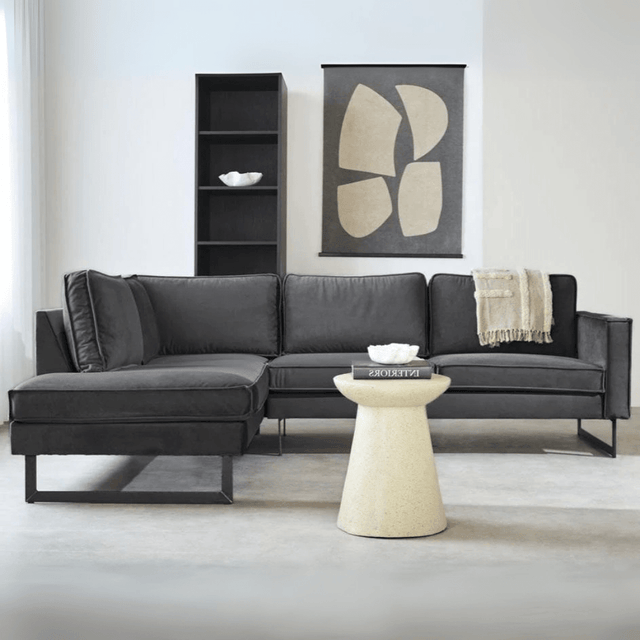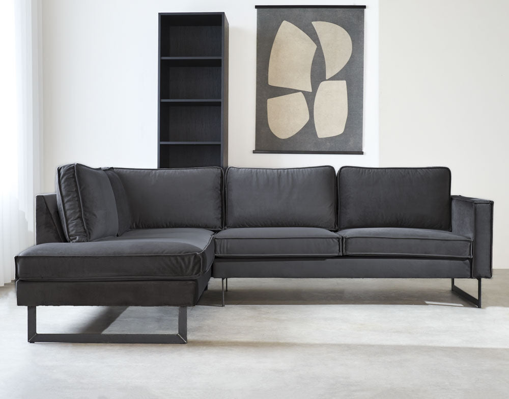 The corner sofa Quinn is a valuable addition to any interior. The corner sofa is very comfortable, stylish, and industrial thanks to the combination of the black metal legs and the matte velvet. Velvet sofas are easy to combine with different materials and interior styles and also create a warm atmosphere. The corner sofa Quinn features wide seats where you can easily sit with multiple people.