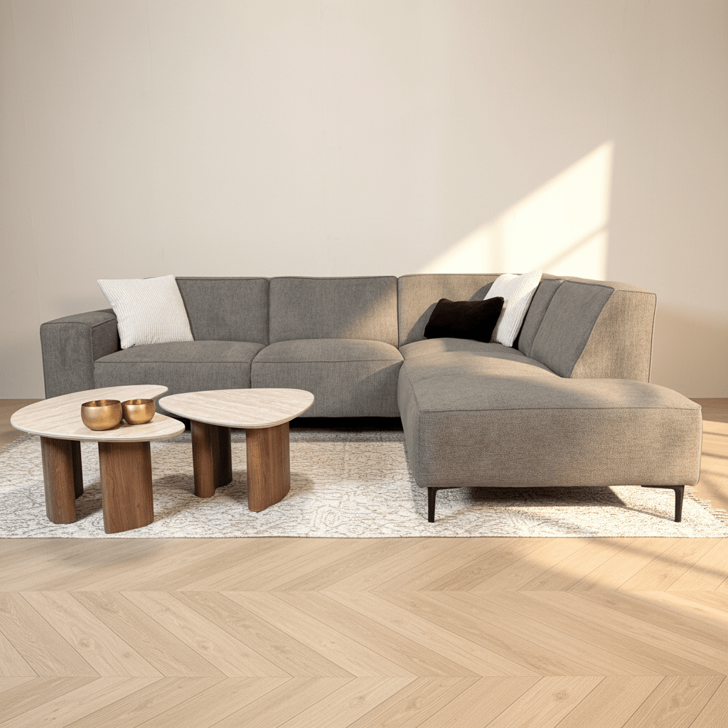 The gray variant is a gray sofa combined with a mid-tone beige. Therefore, we could have given the Ravi corner sofa different color names.