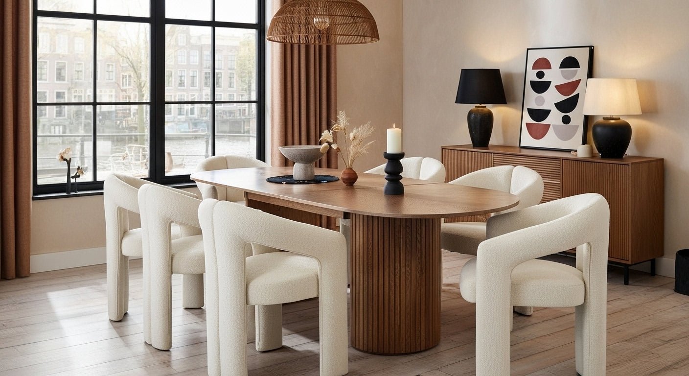Bouclé, a durable and luxurious fabric with soft texture and loops, adds comfort and style to furniture, making it perfect for a warm and chic look in any interior.