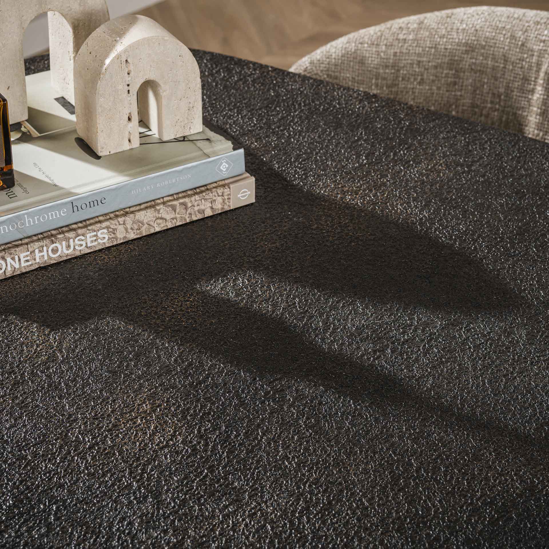 Combine with soft fabric chairs and an elongated pendant lamp above the center for an inviting, balanced setting.