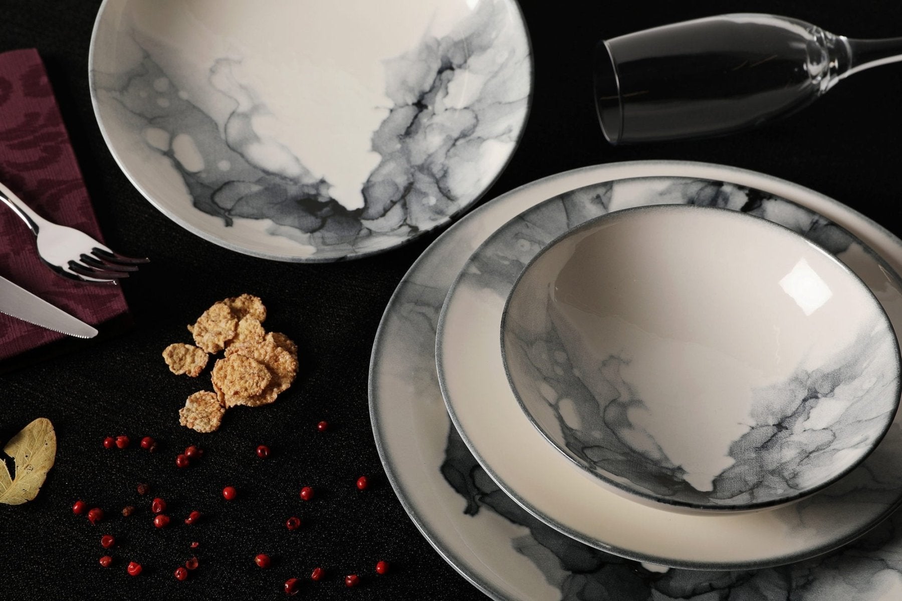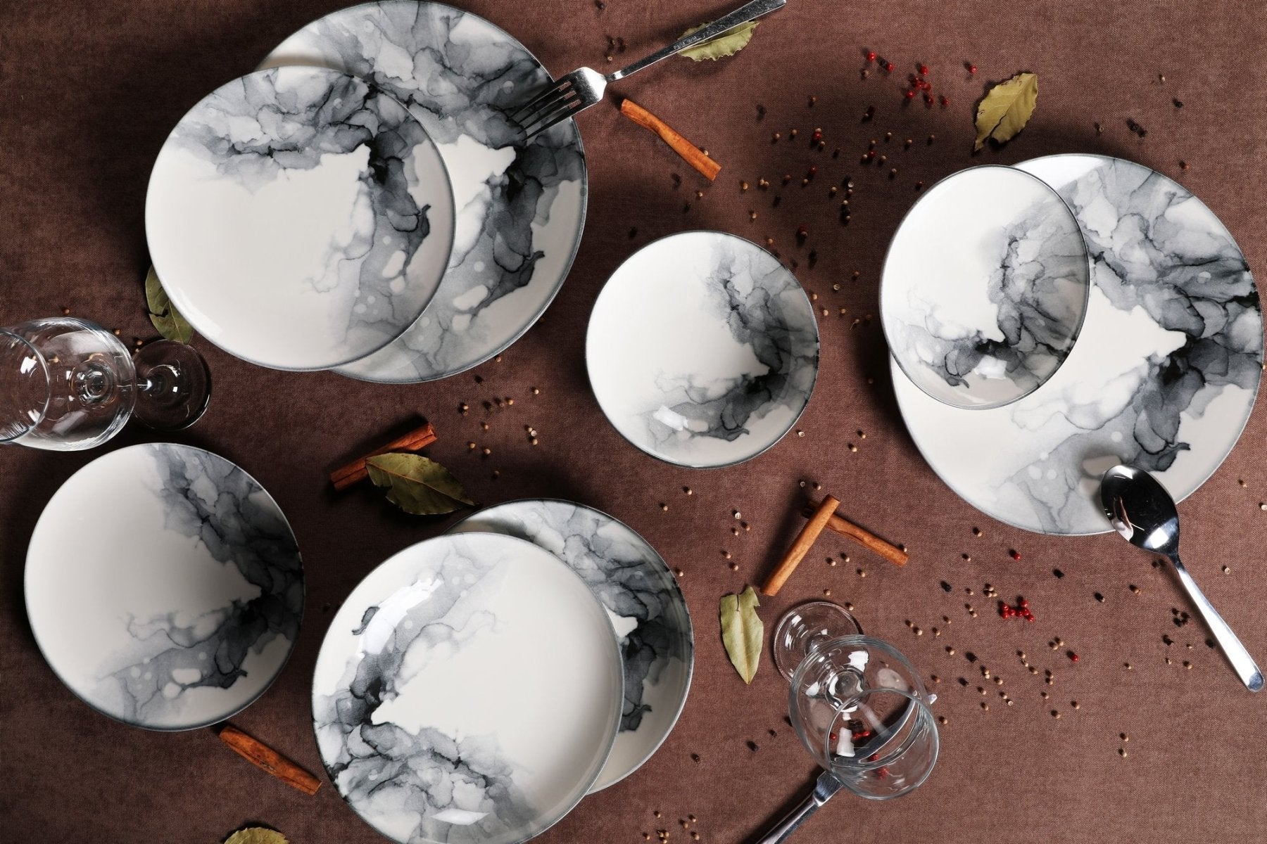 Servies set porselein - 24 delig - Wit marmer - Graphite