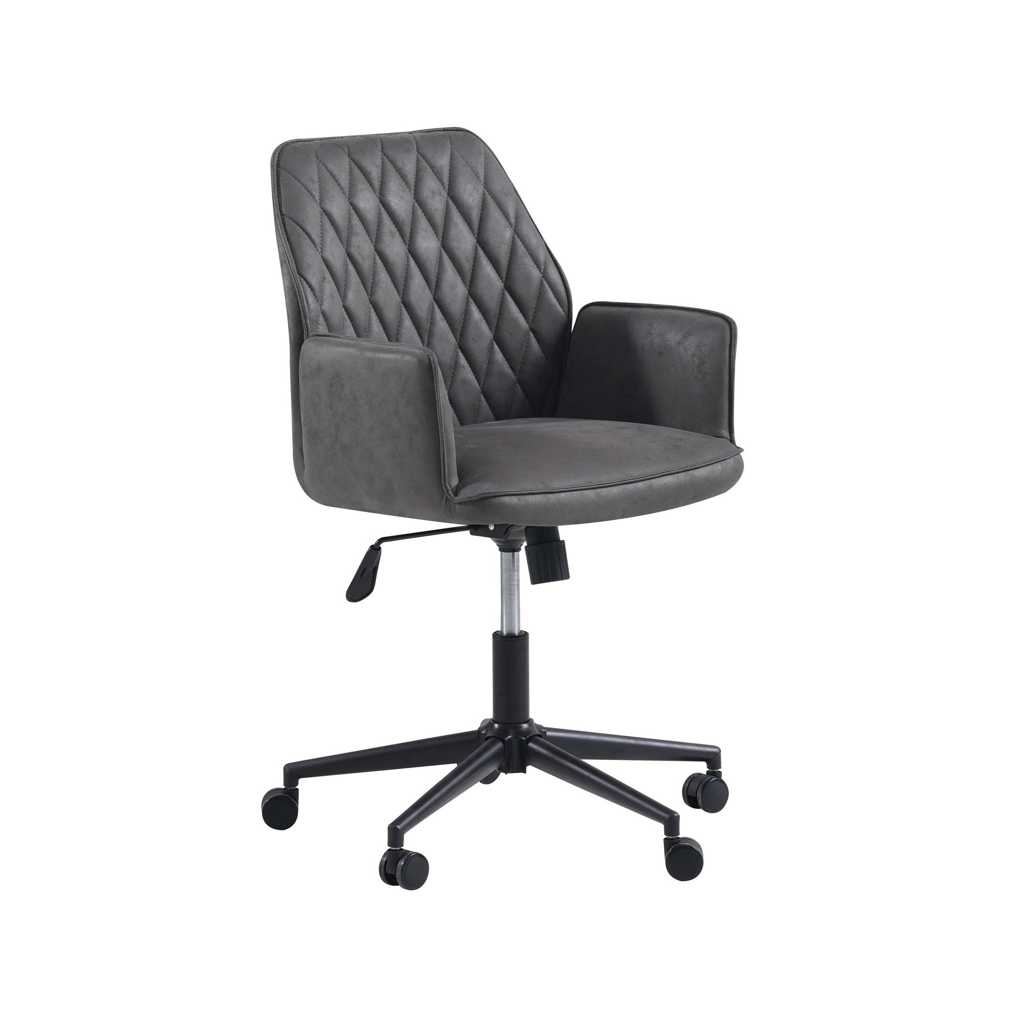 The swivel office chair Novan features a sturdy metal frame with five black wheels.