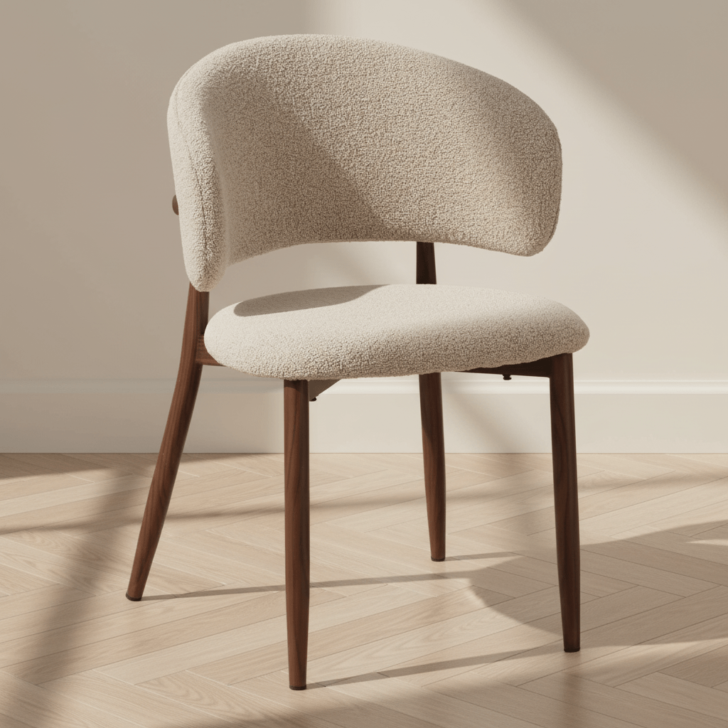 The Yuka dining chair is covered with luxurious boucle fabric, known for its warm, woolly appearance and soft texture. The legs are made of metal and finished with a realistic walnut wood look, providing the perfect balance between style and sturdiness. The combination of soft fabric and natural tones creates a timeless look.