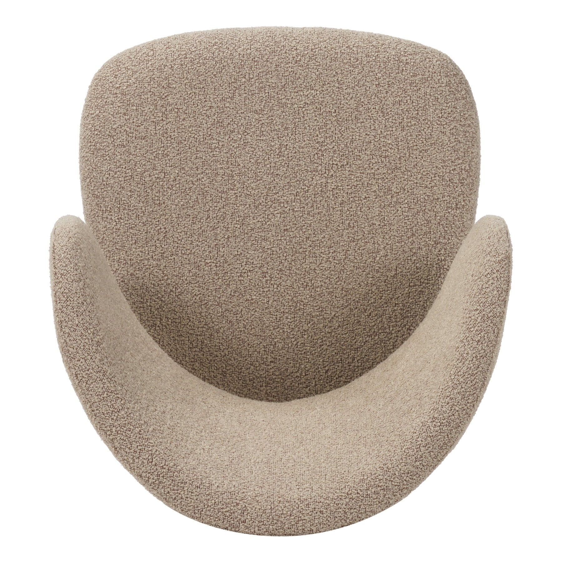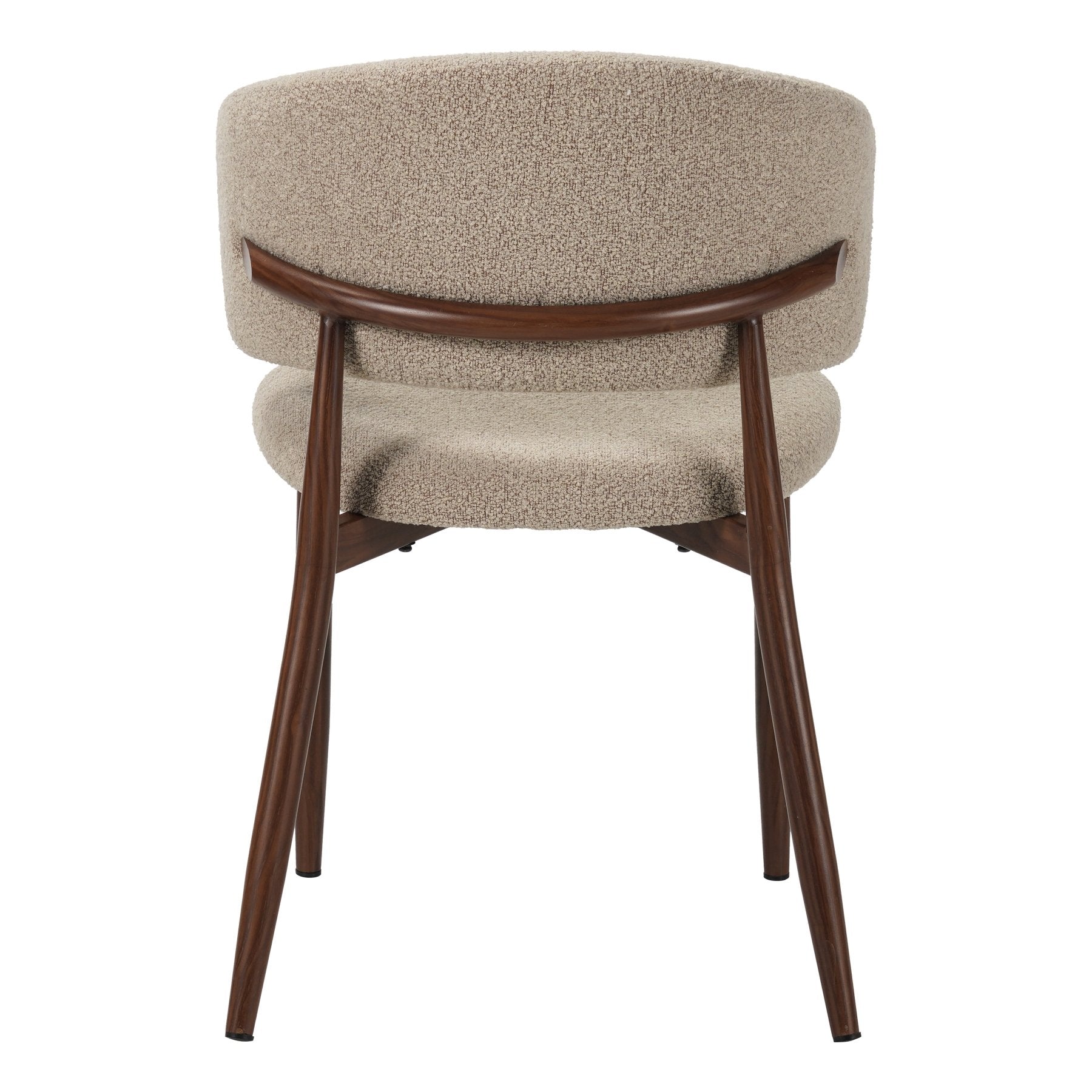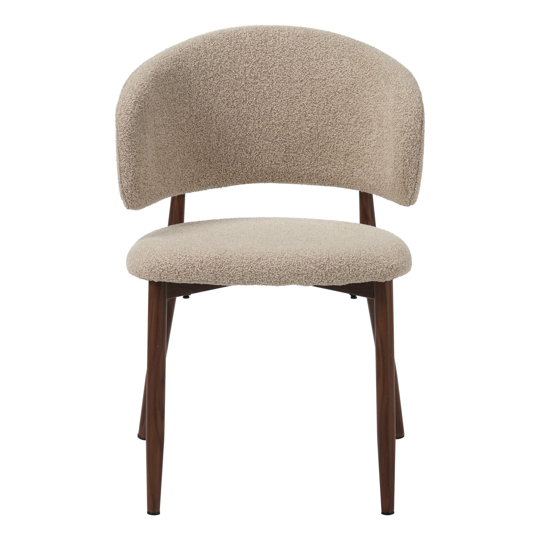 Dining chair Yuka is a real eye-catcher for your dining area! The soft boucle fabric in sand color creates a warm and stylish appearance, while the rounded shapes of the backrest give the chair a modern, playful look. Thanks to the combination of a comfortable seat and sturdy metal legs with a walnut wood look, Yuka fits perfectly within a Scandinavian or Japandi interior.