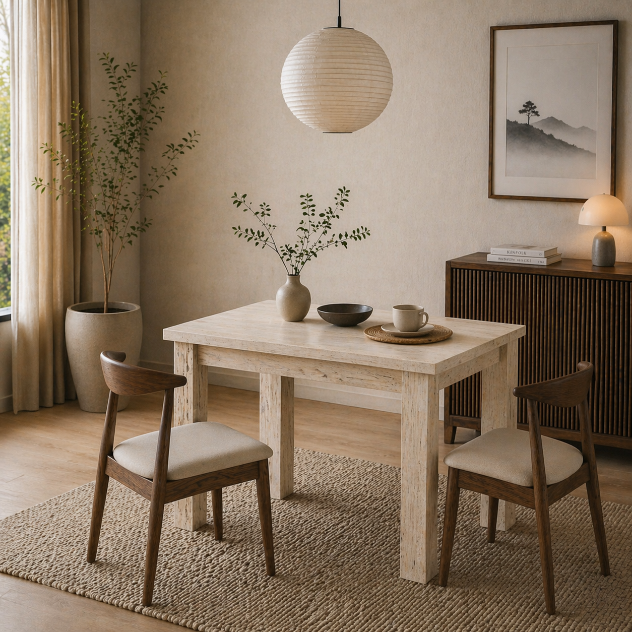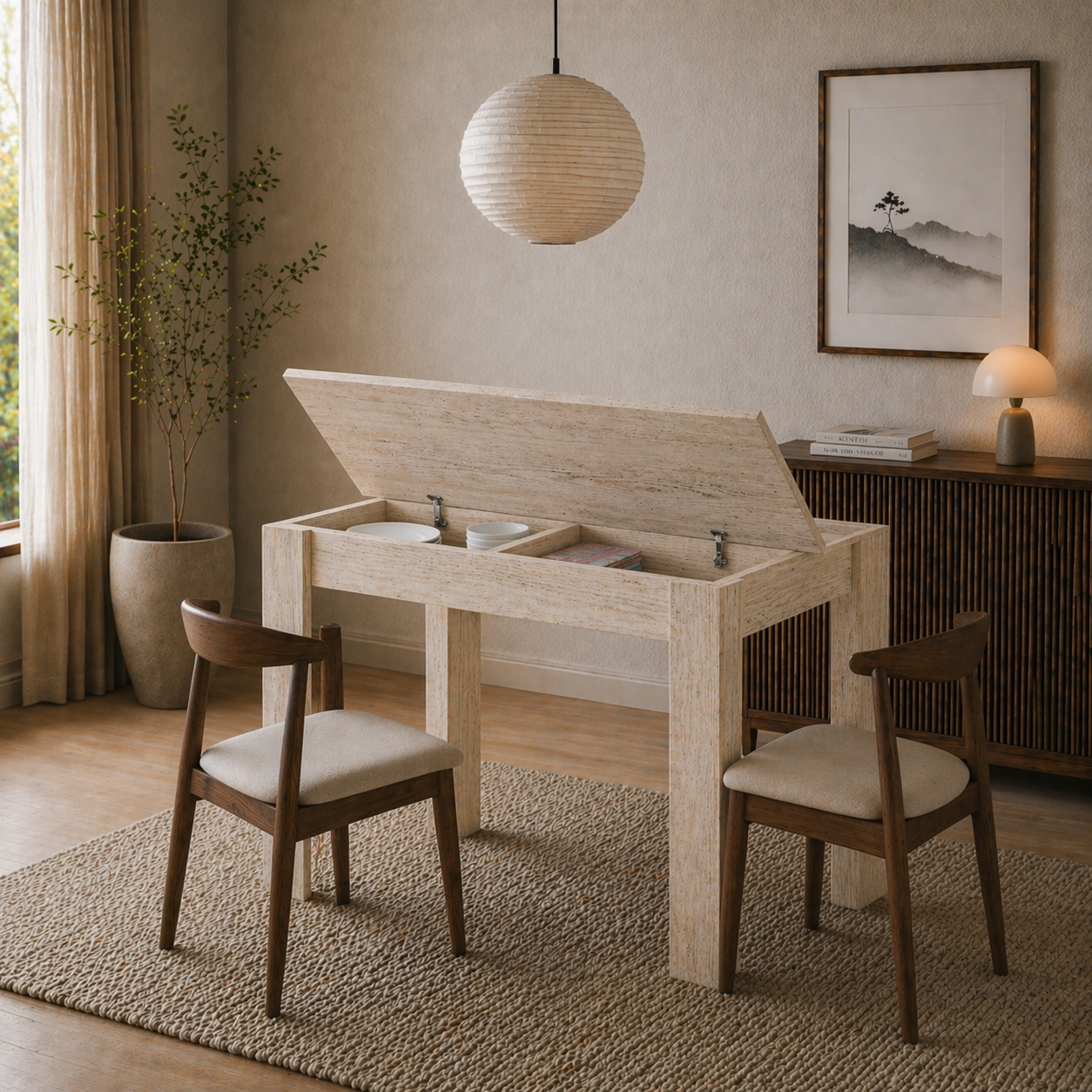 Wat deze tafel écht onderscheidt, is de geïntegreerde opbergruimte onder het blad. Perfect voor het opbergen van placemats, servies of andere spullen die je graag binnen handbereik hebt, zonder dat het rommelig oogt.