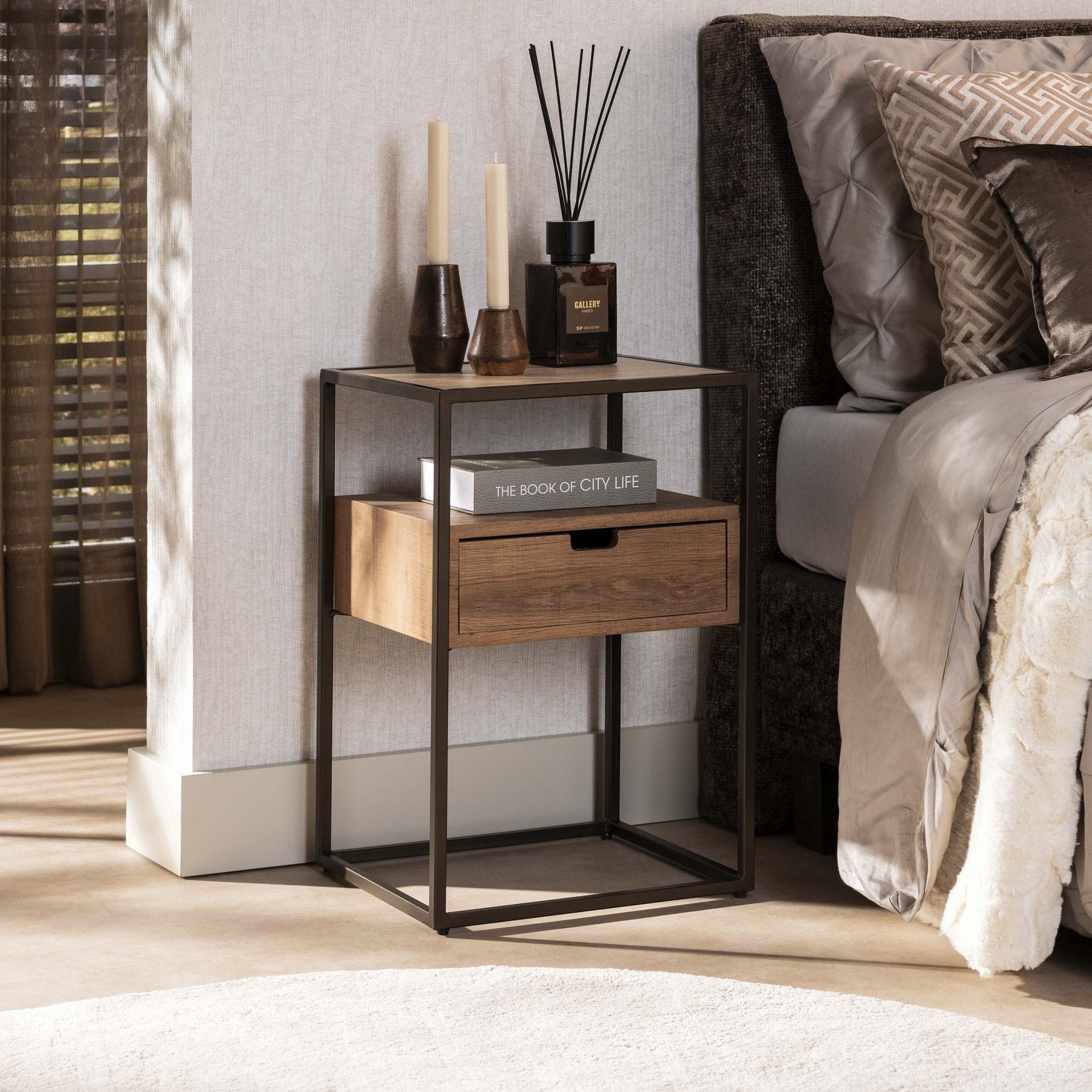 De praktische lade houdt je essentials uit het zicht, terwijl het blad ruimte biedt voor een lamp, boek of glas water. Door de neutrale travertin tint combineert dit nachtkastje prachtig met hout, zachte stoffen en zowel lichte als donkere kleurpaletten. Zo creëer je in een paar stappen een rustige setting waarin je makkelijker tot ontspanning komt.
