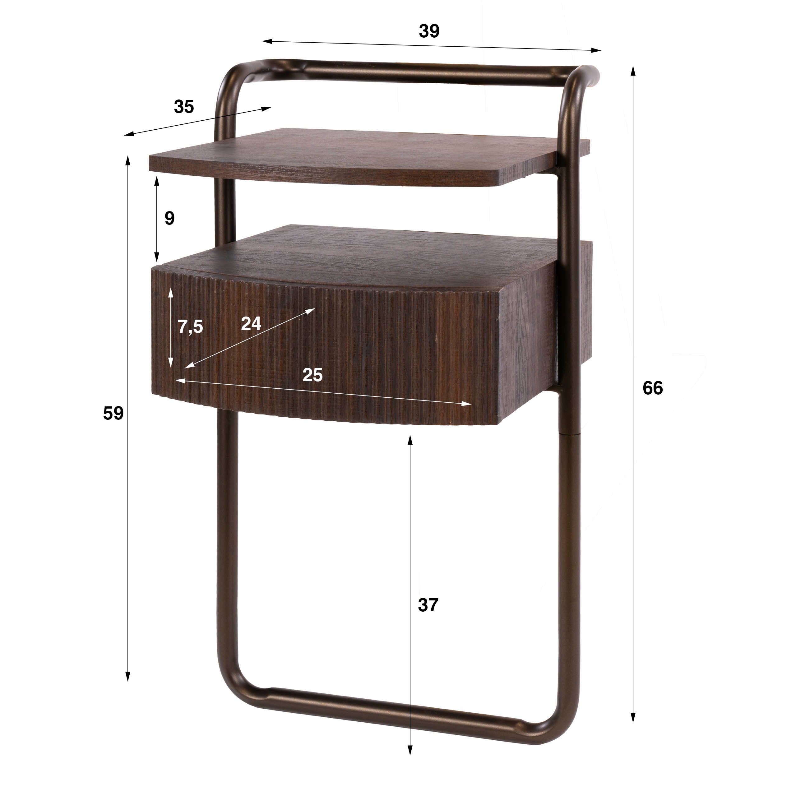 Description and specifications of Nachtkastje met 1 lade donkerbruin hout brons frame Blaze