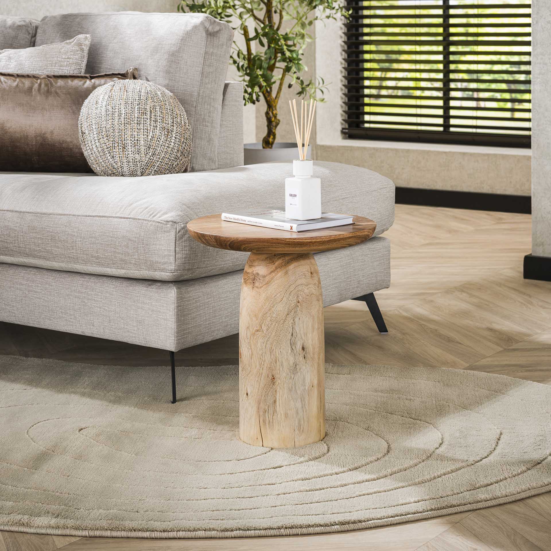 The Odin side table is made from solid acacia wood and brings warmth and character to any interior. With its compact dimensions, you can easily slide it next to the sofa, as a plant table, or as a stylish nightstand. The natural grain pattern and warm tone make each piece unique, while the sturdy construction of 11 kg offers solid stability. Combine with other acacia wood furniture for a harmonious whole.