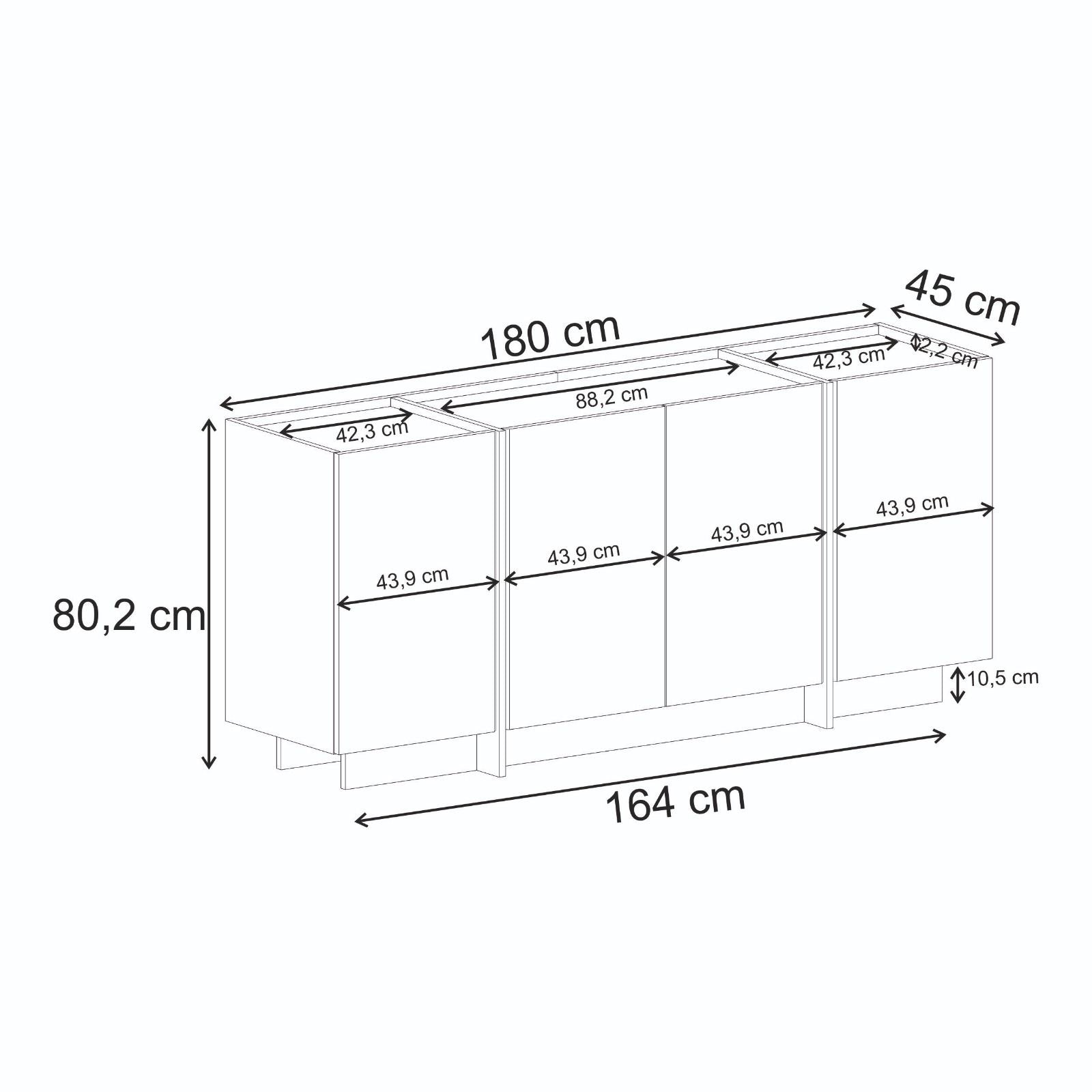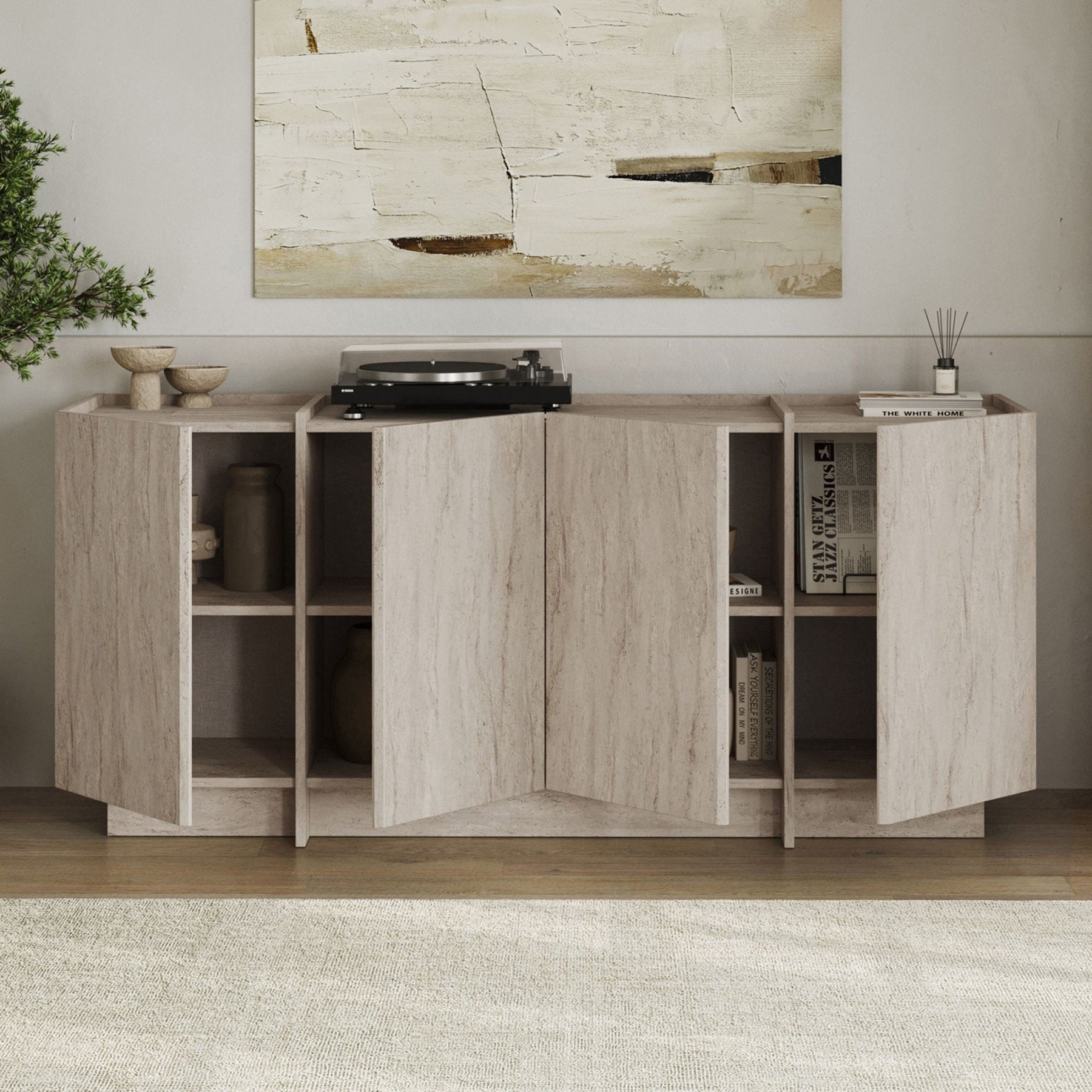 This sideboard is crafted from high-quality travertine-look melamine. This material provides the natural and warm appearance of real travertine, but with the practical benefits of melamine: it is highly scratch-resistant, colourfast, and very easy to maintain. A simple wipe with a damp cloth is all that is needed to keep your furniture looking brand new for years to come.