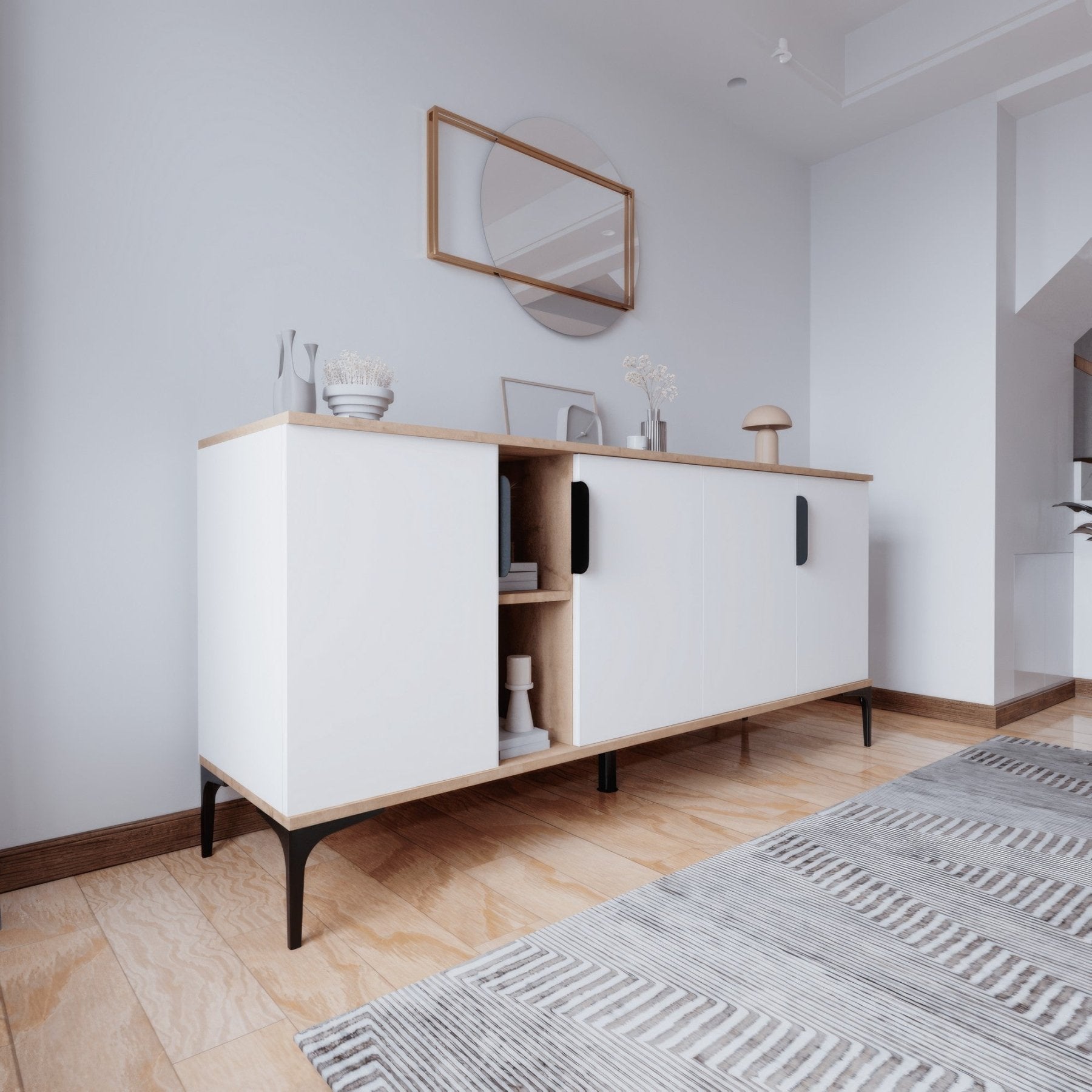 Materiaal: gemelamineerd hout. De sterke melamine toplaag maakt het dressoir slijtvast en prettig in dagelijks gebruik. Vlekken veeg je eenvoudig weg en het oppervlak blijft lang mooi, ideaal voor een druk huishouden.