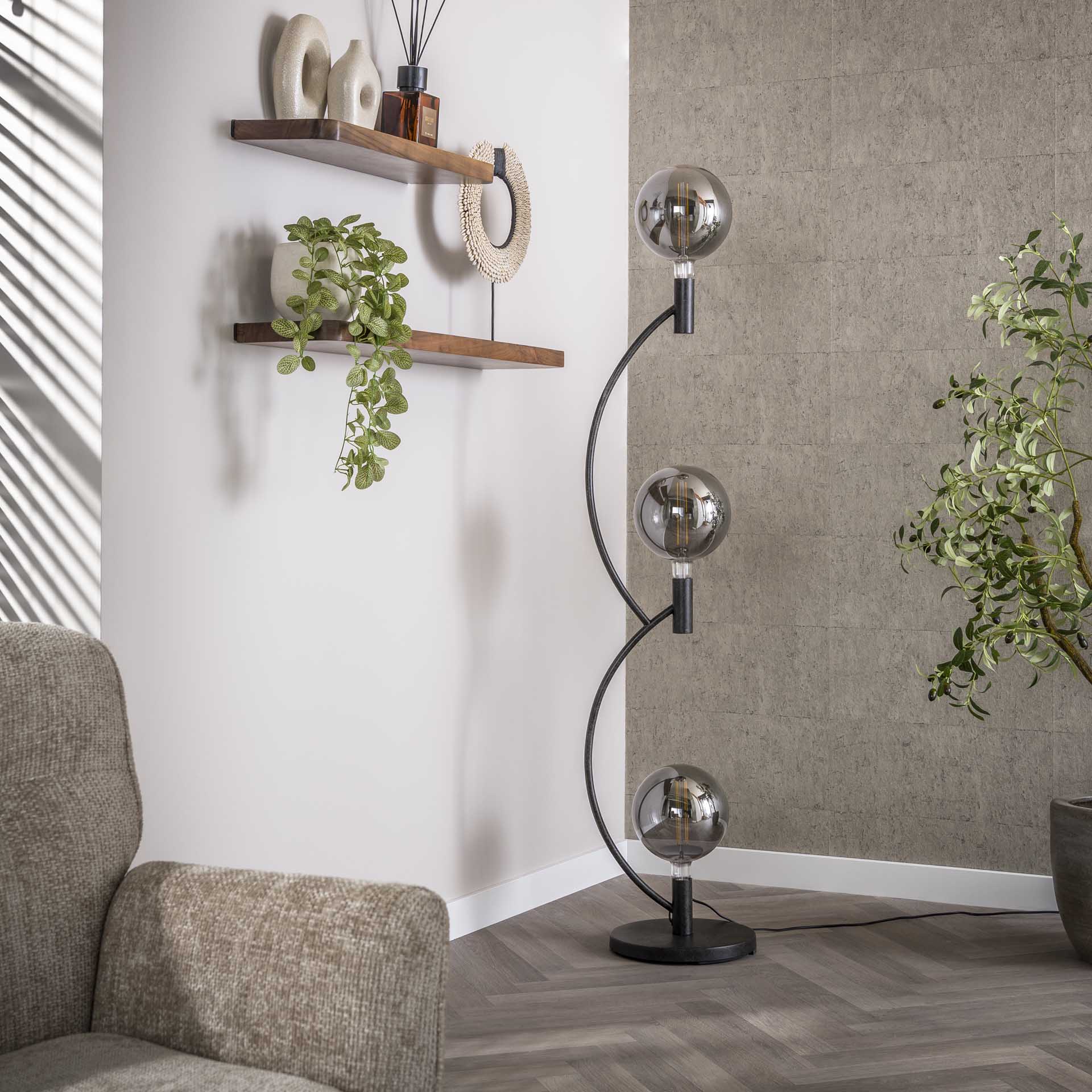 The Niro floor lamp is a modern, black metal standing lamp with three light points. Thanks to its understated design and matte black finish, this floor lamp is a subtle yet distinctive addition to the interior. With a height of 160 cm, the lamp provides enough reach to serve as both ambient lighting and focused reading light. Its compact footprint makes placement next to a sofa, armchair, or reading nook easy.