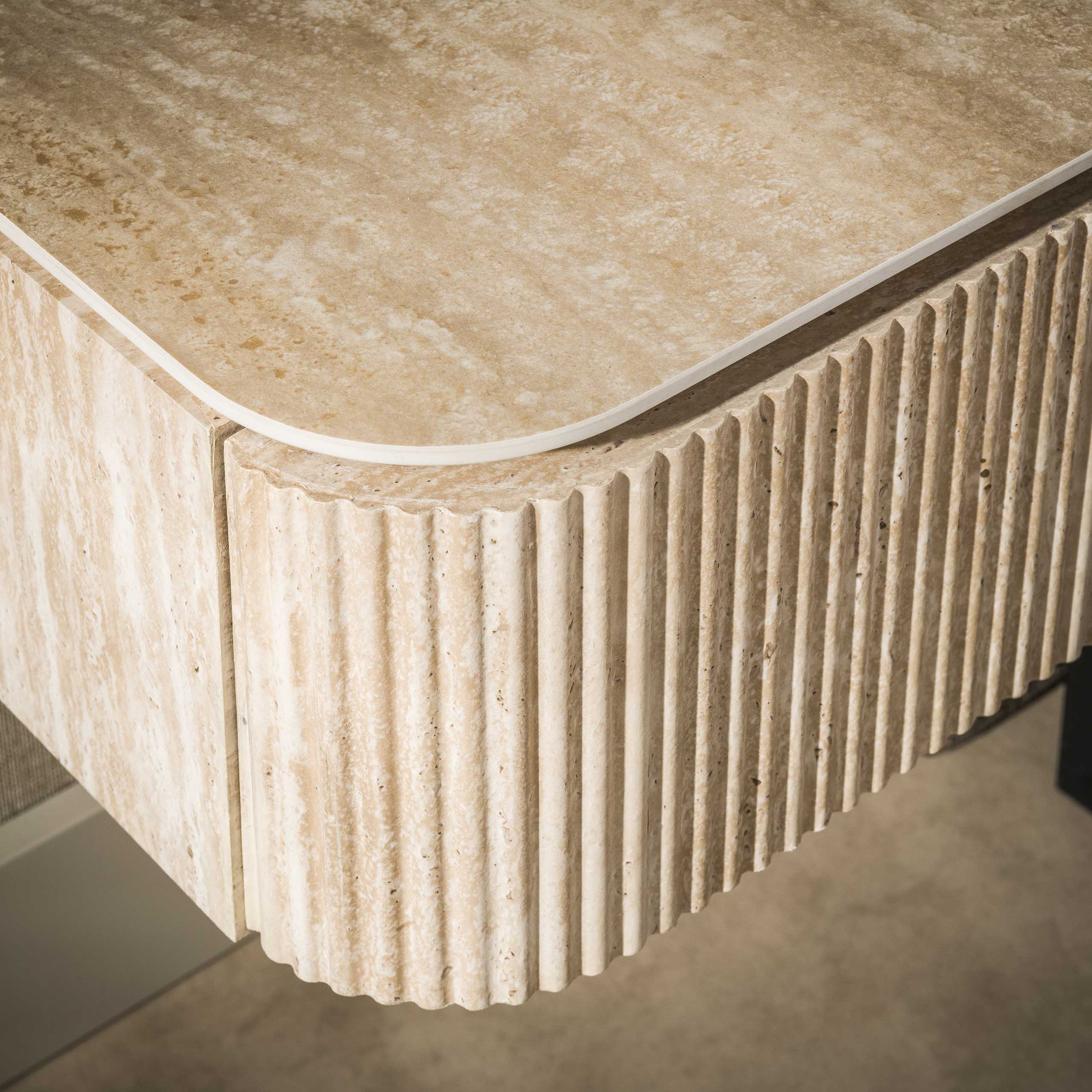 Geef je slaapkamer een luxe, rustige uitstraling met het zwevende nachtkastje Jimi. De elegante boogvorm en de stijlvolle keramiek travertin afwerking zorgen voor een moderne, hotel-chique look. Dankzij het zwevende ontwerp oogt de ruimte luchtiger én is schoonmaken onder het kastje extra eenvoudig.